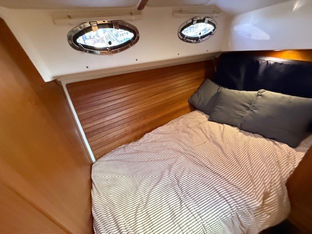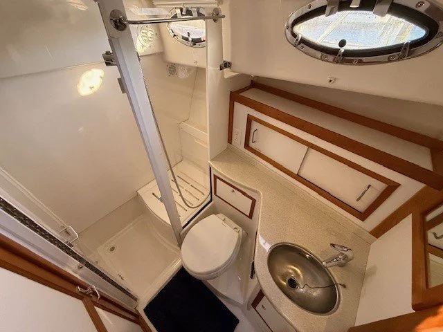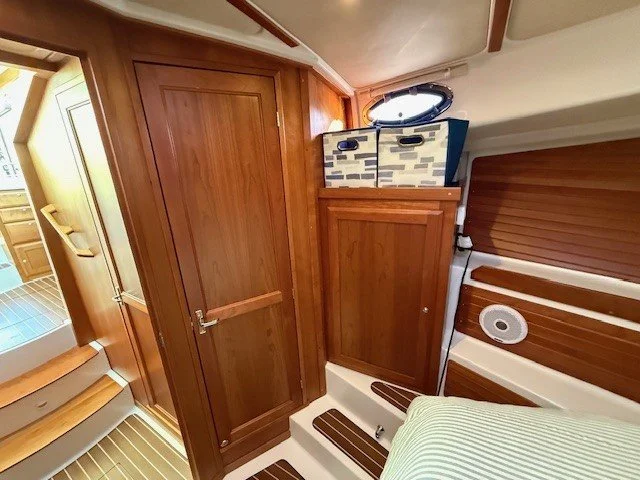 In the master stateroom there is an island berth for ease of egress, and for stowage of owner’s gear, there are many lockers and drawers provided. To starboard aft of the master is a full guest cabin with a pullman berth and ample storage capacity. Opposite and to port is a large head unit with separate stall shower.