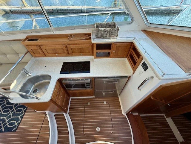 Between the lower and salon sole levels, the mid-galley is fully equipped with a refrigerator, freezer, microwave oven and deep stainless steel sink as well as many drawers and lockers for galley storage. Large windows overhead provide the galley with ample visibility and light.