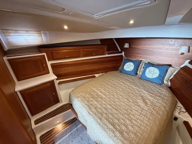 The Back Cove 41 is the perfect choice for serious cruisers. The flagship of the Back Cove fleet, the Back Cove 41 is fitted with an efficient single diesel engine and straight shaft. The addition of thrusters, a generator set, and reverse cycle heat and air conditioning systems make her maneuverable, efficient, and comfortable. Her interior is balanced between two luxurious staterooms, each with a private head. Nautically sensible details and Maine craftsmanship can be found throughout her American cherry interior.