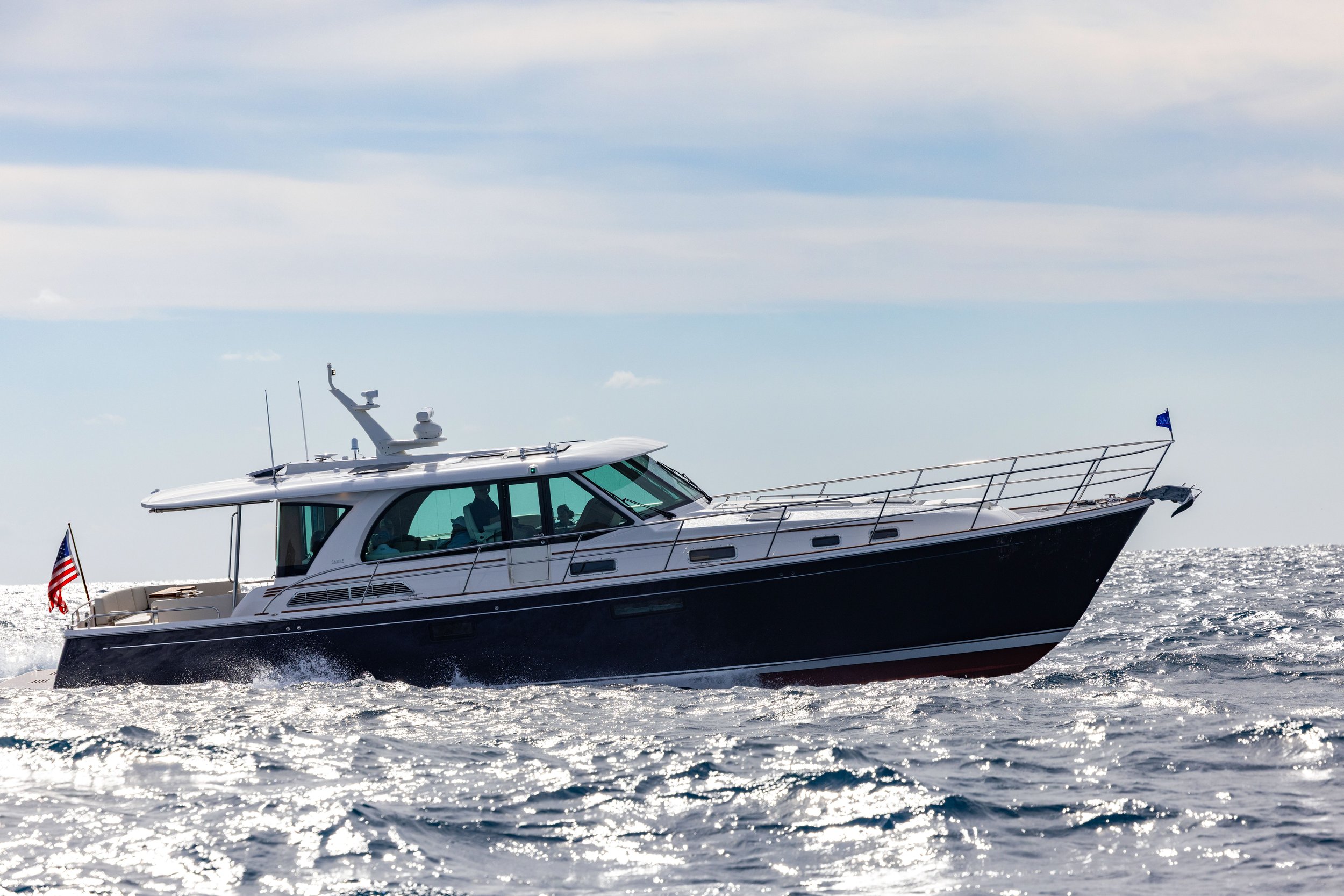 The Sabre 51 Salon Express is designed to elevate every moment on the water. With intuitive joystick controls, Volvo IPS propulsion, and advanced digital systems Sabre Connect, you’re always in command—whether cruising at speed or docking with precision. Expansive cockpit seating and a versatile foredeck lounge, complete with a stowable sunpad and twin seats, create inviting spaces to relax, gather, and take in the view. Below deck, the experience is equally refined. A galley-down layout keeps the salon bright and open while providing generous pantry storage for extended cruising. Two spacious staterooms, each with a private ensuite head, offer quiet retreat, and an optional third berth with its own head gives you the flexibility to host additional guests. Every detail of the 51 is crafted for comfort, connection, and confidence underway.